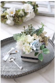 プリザーブドフラワー、アーティフィシャルフラワー、プラスター(石こう)フラワーが入っている手のひらサイズのプチアレンジです。ちょっとしたスペースに飾ると可愛らしい印象になりますよ。